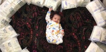 Bangga dengan usaha dan hasil yang telah dia perolehi, Nia dapat idea untuk mengatur semua beg susu beku di sekitar anaknya.