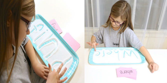 Mula-mula, tuang dan ratakan separuh cawan garam ke dalam dulang yang berwarna-warni. Kemudian, minta anak anda untuk menggunakan jari kecilnya itu untuk menulis perkataan yang ada pada kad belajar atau flash card yang telah anda sediakan tadi.