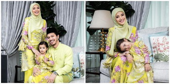 Keluarga bahagia itu turut berkongsi hantaran di Instagram memaparkan foto mereka mengenakan persalinan sedondon warna hijau pucuk pisang.