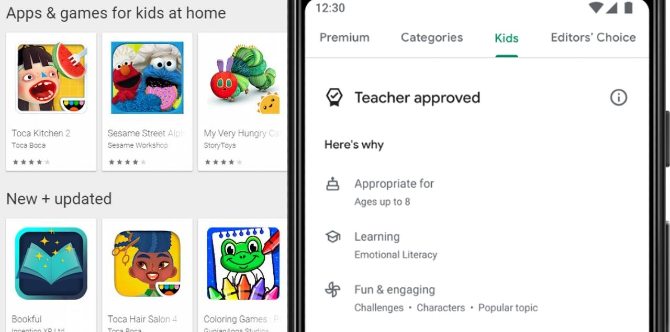 Sekiranya anda ingin menyemak imbasan kandungan ini, boleh pergi ke tab ”kanak-kanak” dan jika anda pelanggan Google Play Pass, banyak pilihan kandungan ”Diluluskan oleh Guru” tersedia dalam ”Aplikasi dan permainan untuk anak-anak”.