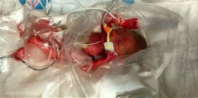 Seorang bayi pramatang 23 minggu selamat dilahirkan tapi badannya sangat kecil sehingga muat dalam beg plastik yang berukuran saiz kotak pensel sebelum dipindahkan ke inkubator.