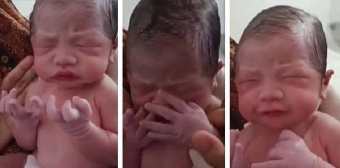 Pastinya ada sahaja aksi bayi yang baru dilahirkan. Berbeza dengan kali ini apabila bayi membuat gestur tangan menadah ke atas seakan-akan dirinya sedang berdoa.