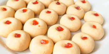 - Sebelum disusun di atas dulang pembakar, sapukan sedikit mentega ke atas dulang pembakar. Selepas itu, susunkan adunan yang berbentuk bulat ke atas dulang pembakar. Kemudian, hiaskan adunan biskut tersebut dengan ceri yang berwarna merah ataupun hijau.