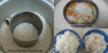 Jika mahu bubur lembik, kurangkan beras. Manakala nasi dalam periuk pula masak seperti biasa.