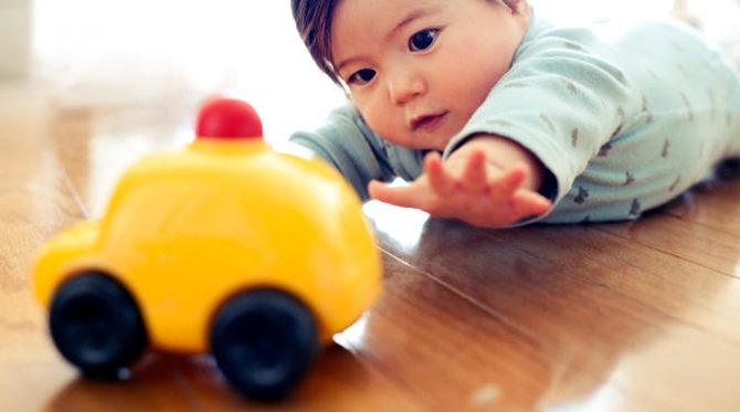 Apabila bayi sudah pandai bergolek dan baru mula merangkak, ibu bapa boleh beli mainan yang boleh bergerak seperti bola untuk menggalakkan anak mencapai dan bergerak.