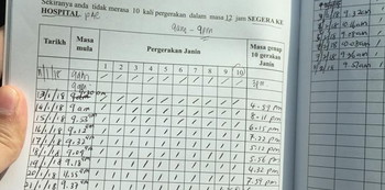 Perhatikan pergerakan bayi sampai 9 pagi. Untuk merekodnya, apabila satu gerakan yang sangat kuat, tak kiralah gerakan yang sangat kuat itu tiba-tiba ada gerakan kecil di masa yang sama, kita ambil satu gerakan sahaja.