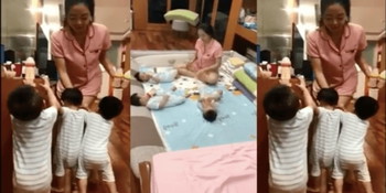 Mereka bertiga kelihatan menyelak bajunya, sambil menangis dan merengek minta botol susu. Tetapi sebaik sahaja si ibu bangun dan berjalan pergi dengan botol-botol itu, bayi kembar tersebut dengan patuh mengikutnya ke katil.