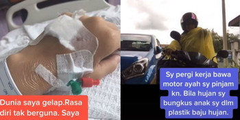 ”Saya pergi kerja bawa motor yang ayah bagi pinjam. Bila hujan saya akan bungkus anak dalam plastik baju hujan.” kongsinya