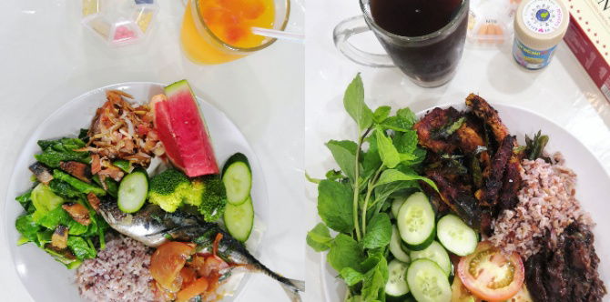 10. Detox drink, Mix rice, Ikan Panggang dengan Sambal, Tauhu Tumis, Bayam Celur