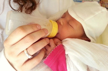 Cradle him. Placing the baby’s head in the crook of one arm and the other around or underneath the baby, lift the arm with baby’s head slightly so he’s in a semi-upright position. Never feed babies lying down: formula can flow into their middle ear and cause an infection.