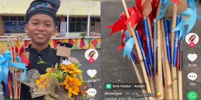 Baru-baru ini tular di dalam media sosial TikTok berkenaan video dimuat naik seorang ibu menerusi akaun @nanijoe03 yang menghadiahkan rotan untuk guru anak lelakinya. Menerusi video dimuat naik, hadiah tersebut dihantar ke sekolah dan diserahkan kepada anaknya.