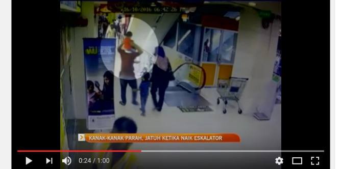 Elakkan mengendong anak dan meletakkannya di duduk di bahu anda semasa menaiki escalator kerana dikhuatiri anak akan terjatuh, kerana posisi anak pada ketika itu terlalu tinggi dan tidak stabil untuk menuruni eskalator.