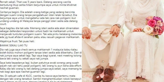 Peguam ini yang berkongsi posting di laman Facebook berkata wanita berkenaan memerlukan khidmat nasihatnya untuk berkahwin dengan teman lelakinya secara sah mengikut undang-undang, tetapi tidak mahu persetujuan dari isteri lelaki berkenaan.