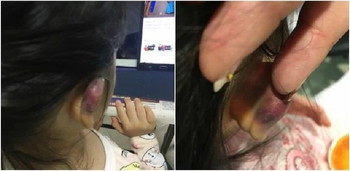 Apabila mereka sampai di rumah, suami menyuruh saya periksa telinga anak saya dan saya terkejut apabila melihat telinganya lebam teruk sehingga bengkak.