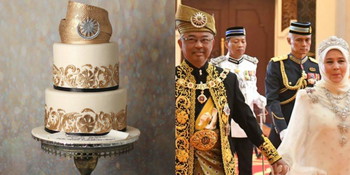 Kek viral dua tingkat yang menakjubkan itu mempunyai corak indah dengan warna emas dan krim di bahagian tepi dan di atasnya dihias dengan replika Tengkolok Diraja sekaligus menampakkan kemegahannya.