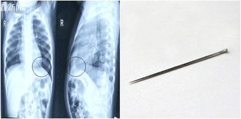 Jarum berukuran 2mm diameter telah dikeluarkan dengan jayanya dari badan kecilnya itu. Jarum tersebut kelihatan sudah berkarat dan memberi petunjuk bahawa jarum itu sudah lama berada dalam tubuhnya.
