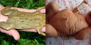Sindrom ini digambarkan dengan keadaan fizikal bayi menggambarkan ketiadaan abdomen pada bahagian hadapan. Ia dikenali sebagai kenan katak di dalam masyarakat Melayu.