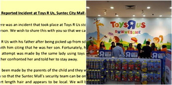 The child’s parents have lodged a police report, and requested Toys ‘R’ Us for video footage of the lady, so that the mall can be alerted about her.