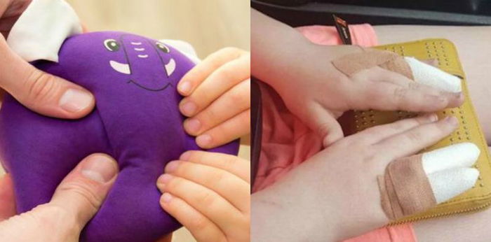 Mainan squishy meletup, tangan kanak-kanak melepuh