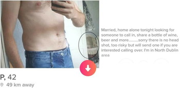 So on Mr P’s listing, it read “Married, home alone tonight looking for someone to call in, share a bottle of wine, beer and more….. sorry there’s no head shot, too risky but will send one if you are interested calling over. I’m in North Dublin area.”