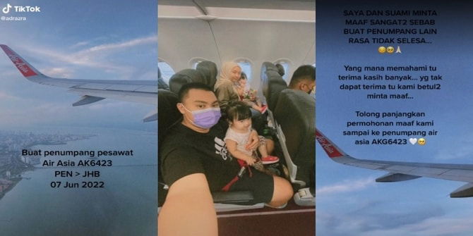 Menerusi perkongsian di Tiktok adrazra, pasangan suami isteri ini memohon maaf kepada semua penumpang pesawat AirAsia, AK6423 dari Pulau Pinang ke Johor Bahru pada 7 Jun 2022 berikutan kejadian anak kembar mereka yang menangis kuat dalam penerbangan itu.