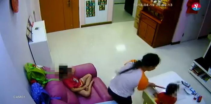 Rakaman CCTV juga mendedahkan yang orang gaji ini memukul budak-budak ini hampir setiap hari selama 10 minit ke satu jam.