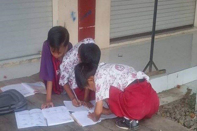 Dalam sebuah gambar berlokasi di Luwu, Indonesia yang tular baru-baru ini, kelihatan dua murid sekolah rendah yang sedang belajar di kaki lima di sebuah pasar.
