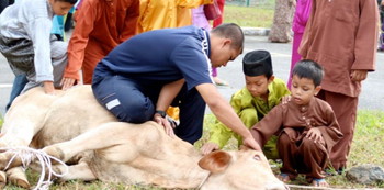 Selesai solat, upacara korban pun dimulakan. Lembu, kambing, dan biri-biri yang dikorbankan akan disembelih secara beramai-ramai di kawasan masjid, dengan hati yang penuh rasa syukur. Daging-daging korban ini kemudiannya akan diagihkan kepada golongan fakir miskin, sebagai tanda kasih sayang dan perkongsian rezeki.