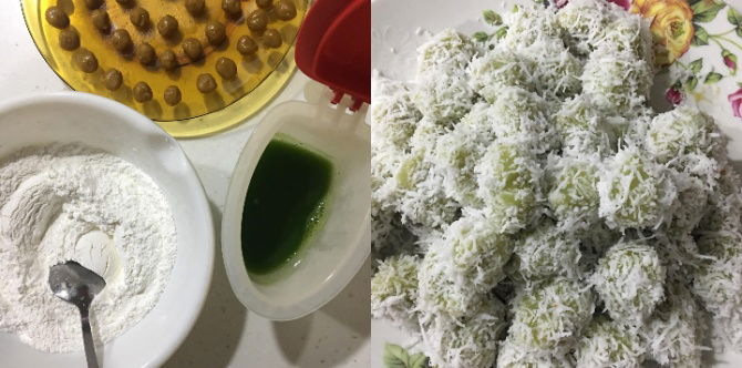 - Bancuh tepung pulut, tepung gandum dan garam bersama jus pandan sedikit demi sedikit sehingga adunan boleh digentel.
