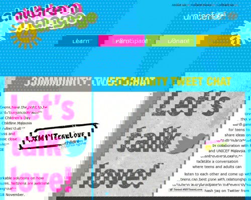UNICEF Malaysia will moderate a group discussion with teens on 18 November at the Kuala Lumpur Convention Centre to gather comments from #MYTeenLove Tweet chat and explore solutions and ideas for teens, families, communities and policy makers.