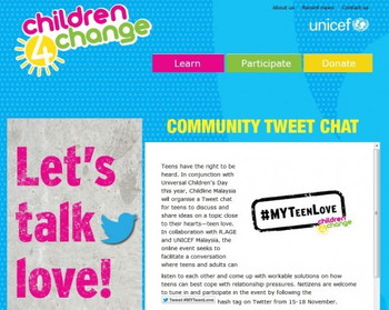 In conjunction with Universal Children’s Day 2012, Childline Malaysia will organize a Tweet chat for teens to discuss and share ideas on a topic close to their hearts – teen love.