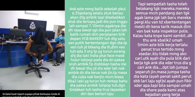 “Agaknya dia dah rasa lewat sangat, dia pun jalanlah balik rumah. Dalam perjalanan balik depan YCB Bakery, datang satu van putih bertentangan dengan dia ada tiga orang tapi turun seorang saja, pakai face mask hulur lolipop pada dia dan paksa suruh ambil.”