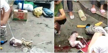 The baby lets out a loud cry as he lands on the ground with a thump, and passersby can be heard shouting, “Hurry, hurry! The baby is going to die! The cord is strangling the child’s neck!”.